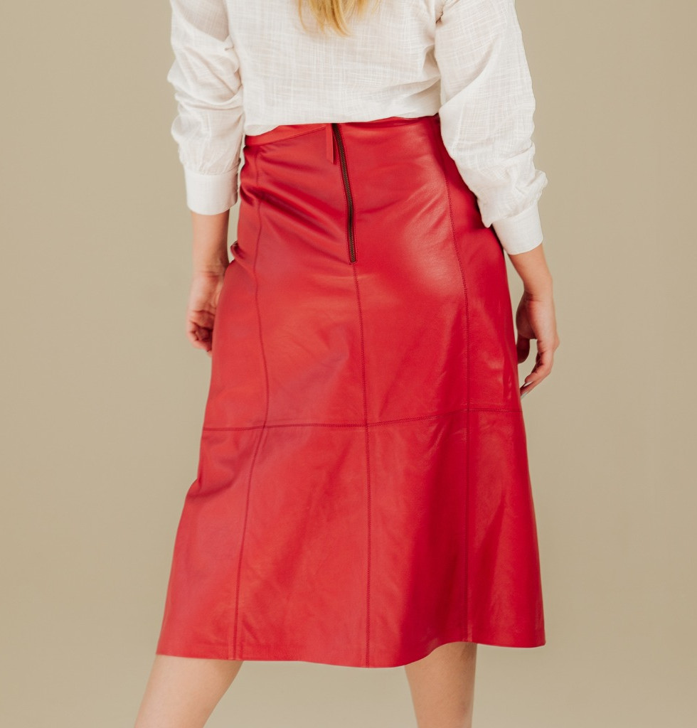 Modelagem em forma A, que valoriza a cintura e abre levemente no sentido das pernas até o comprimento mídi. Possui dois bolsos frontais embutidos com vivo e fechamento nas costas com zíper.